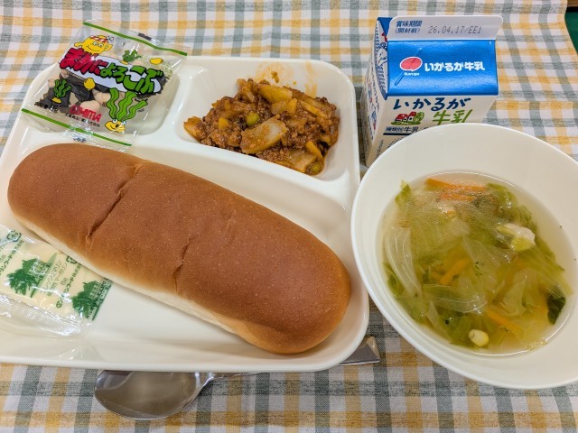 4月13日(月)の給食は「じゃがいものミートグラタン、レタスのスープ、豆こんぶ、コッペパン、マーガリン、牛乳」です。