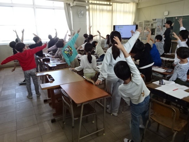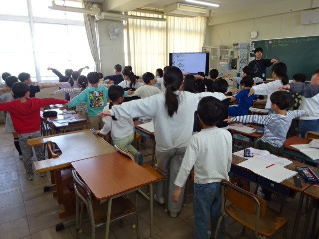 まずは、地図に表される方角「東西南北」がどちらの方向なのかを、体で表現しながら確かめていました。