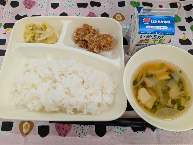 4月21日(火)のこんだては「鶏肉のたつたあげ、五目汁、キャベツの梅風味、ごはん、牛乳」です。