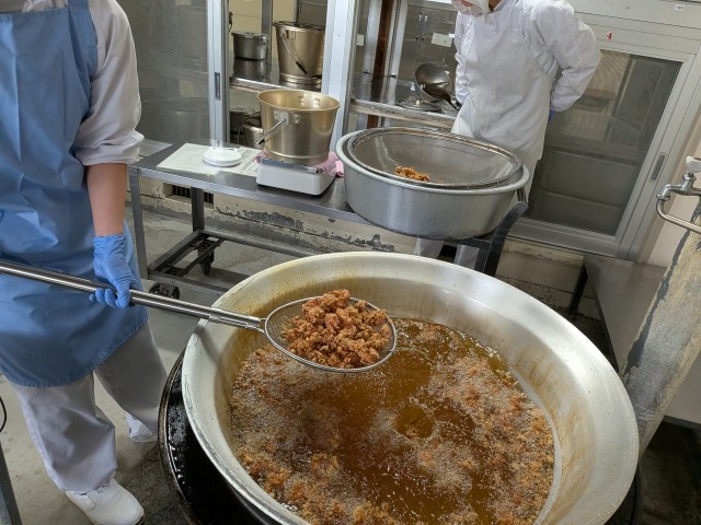 「鶏肉のたつたあげ」は、鶏肉にしょうが、料理酒、こいくちしょうゆで下味をつけ、でんぷんをまぶして揚げています。給食でいつも人気のメニューです。