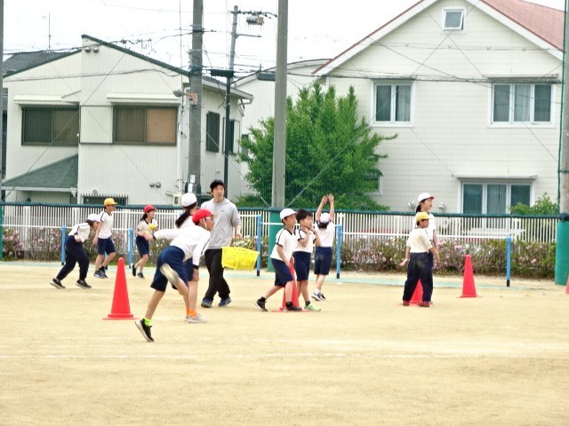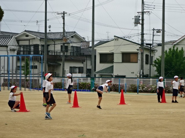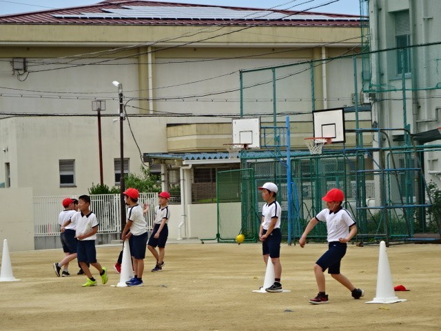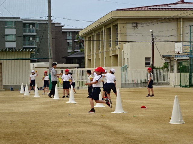 5年生が、体育でソフトボール投げに取り組んでいました。