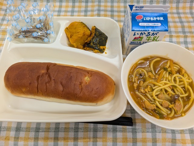 4月27日(月)のこんだては「カレースープスパゲッティ、かぼちゃのマリネ焼き、ミニフィッシュ、おさつパン、牛乳」です。