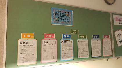 阿倍野小学校の校内にはたくさんの掲示板があります。子どもたちの作品をはじめ、四季折々の写真や詩など、いろいろな工夫がされています。