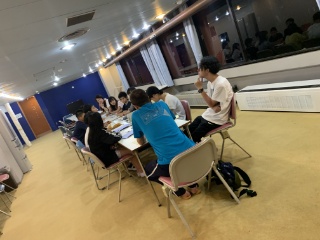 自然体験1日目ももうすぐ終了です!生活班の班長と活動班の班長が それぞれ集まり、今日1日のリーダーとしての活動を振り返っています。