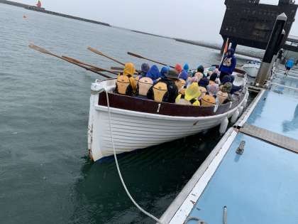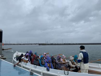 雷がやみ、色とりどりのてるてる坊主さんたち、やっとカッター体験です!風があるため、今日は陸にロープはつないだままです!