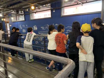 室内でオリエンテーリングをしています!海洋センターには、クイズのヒントがたくさん!班で協力して見つけられるかな??