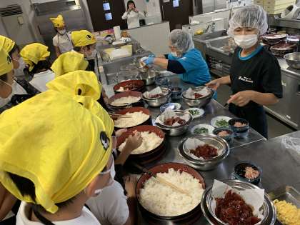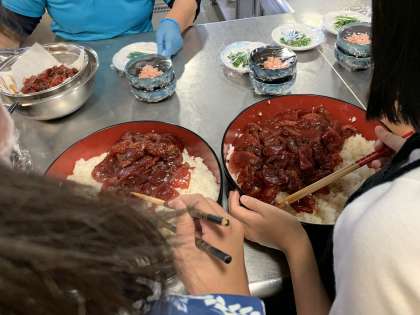 たくさんのカツオや、卵、大葉をを盛り付けていきます。綺麗に美味しく見えるように盛り付けています!