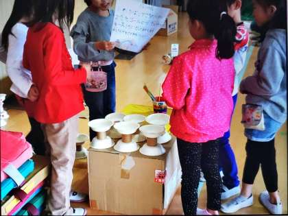 2年生が生活科で学習した色々なおもちゃの作り方。今日は「おもちゃ教室」を開き1年生におもちゃの作り方を教えてあげました。作った後は「おもちゃ大会」を開き一緒に講堂で遊びました。上手に作るポイントや遊び方を、やさしく丁寧に教えてあげることができました。