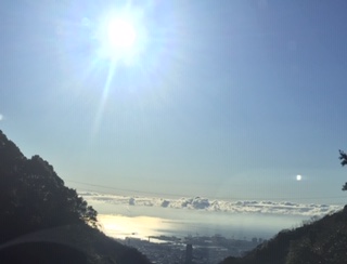 六甲山に登っています。 車窓からの神戸の街。雲を下に見ています。
