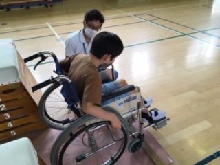 実際に車いすに乗って、障害物をよけたり、段差を越えたりしました。また、車いすを押す体験もしました。