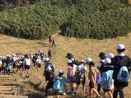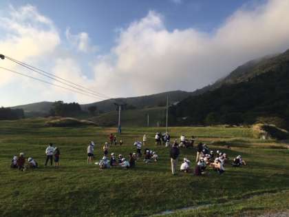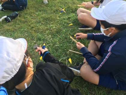 頂上からは、下りの難しさを体感しました。15:40 全員無事下山。ジュースをおいしくいただいた後は、箸作りに挑戦。高原の風に吹かれながら、一生懸命、ナイフを走らせています。