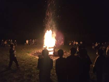 夜のプログラムは、お待ちかね、キャンプファイヤー。鬱蒼とした木々に囲まれて雰囲気満点。神秘的な火を囲んで、盛り上がっています。