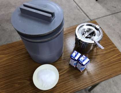 材料を混ぜた缶の周りを氷と塩で埋めてコロコロ転がして作ります。