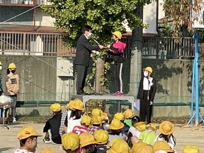 今日の児童集会で、たてわりオリエンテーリングの閉会式を行いました。上位3班が全校児童の前で校長先生から表彰を受けました。