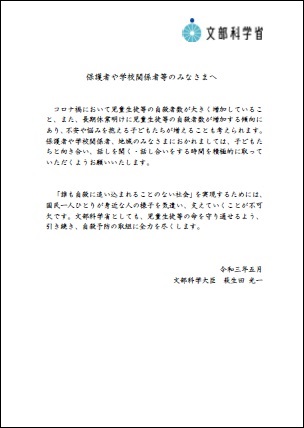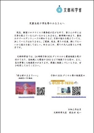 児童生徒の皆さんや保護者の方々に向け、文部科学大臣よりメッセージが届きました。
