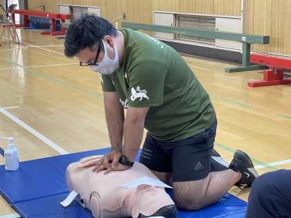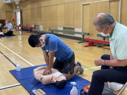 今年度は大阪消防振興協会の方々に来ていただき、AEDの操作や心肺蘇生の仕方についての講習を受けました。