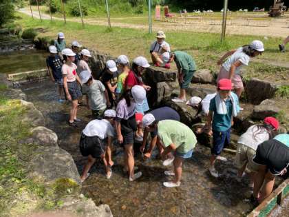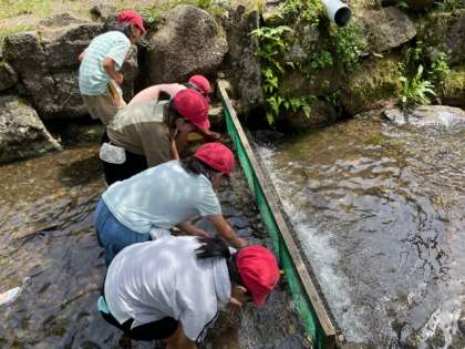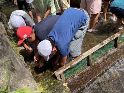子どもたちは、水の冷たさに驚きながら、アマゴを追っています。