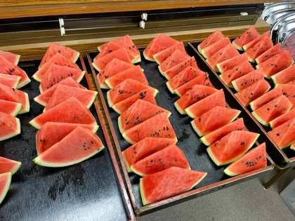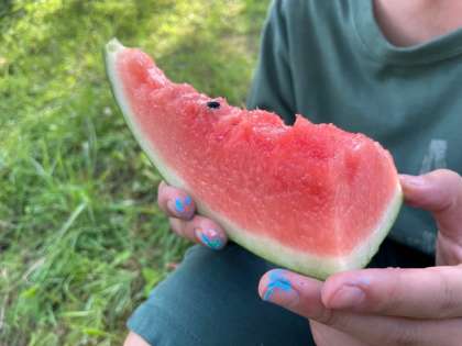焼き板のデザインをしていると、そこに、おいしそうなスイカが登場!宿舎の方々が切って、持ってきてくださいました。