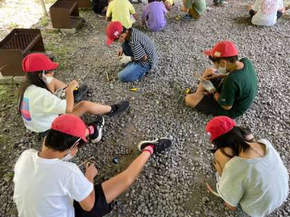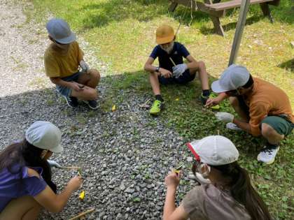 自分たちで作ったアイスクリームのおいしさを味わった後は、「はし作り」に取り組みました。もともと1日目、鉢伏山を降りてからする予定でしたが、渋滞の影響で時間がなくなり、本日の活動になりました。