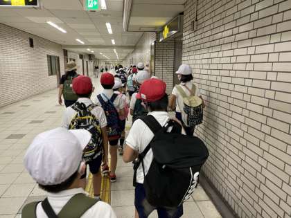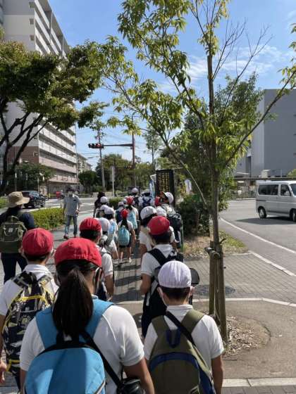 あべっこ班(1〜6年生のたてわり班)で公園をまわり、クイズやゲームにチャレンジします。いよいよ、大泉緑地に到着です。