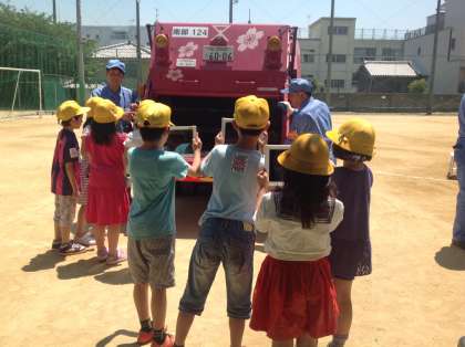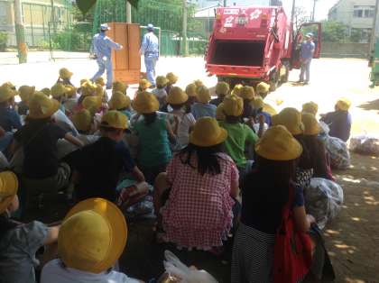 作業員の方からごみの種類や分別の方法についてくわしく教えていただきました。その後は実際にパッカー車(ごみ収集車)を見学しながら説明を聞いたり、実際にごみの投入体験を行ったりしました。また、その様子をこの後の学習にいかせるようiPadでしっかりと記録することができました。