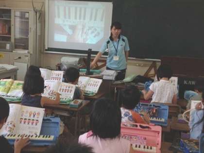書画カメラで大きく提示された先生の指づかいを見ながら、けんばんハーモニカの練習を行いました。