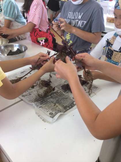 今日は校内で摘み取ったしその葉を、漬けておいた梅の中にいれる作業です。