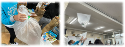4年生の理科の学習「とじこめられた空気や水」の学習です。初めに、袋に空気を閉じ込めて、袋を投げ上げたり、手で押したりして感触を確かめました。次に、空気でっぽうを使って玉を飛ばし、前玉と後玉がくっつかなくても玉が飛ぶことに気づきました。