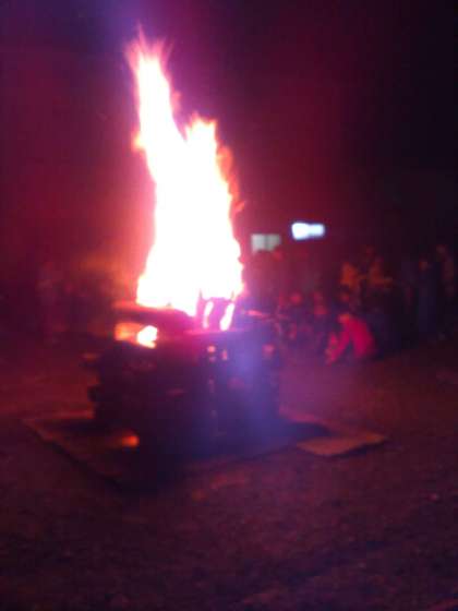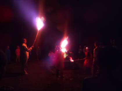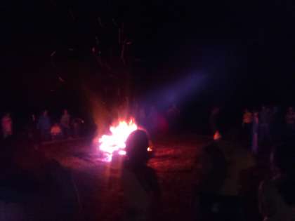 空いっぱいの星の下で、キャンプファイヤーを行っています。