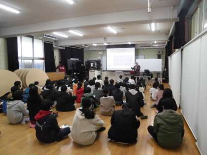 社会科の歴史の学習で、第二次世界大戦について学習しました。そしてこの日は外部講師をお招きし、戦争体験者の貴重なインタビュー動画や、大阪市内の空襲や模擬爆弾の投下についてのお話をきくことができました。子どもたちは一生懸命メモを取りながら話を聞くことができていました。