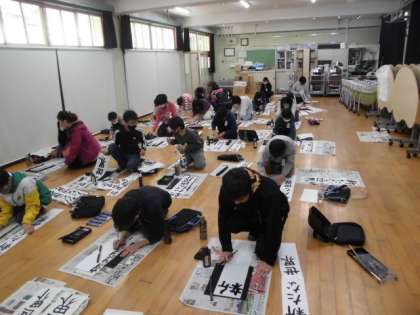多目的室で書初めをしました。今年の文字は「新たな世界」です。中学生になる今年は、どんな新しい世界が待っているでしょうか。