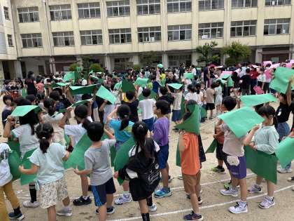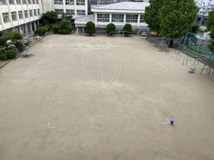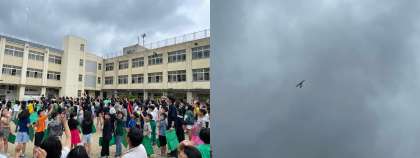 頭の上に画用紙を上げて用意をして、学校の上に飛行機が何度か来ている間に、撮影が終わりました。