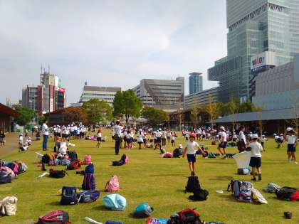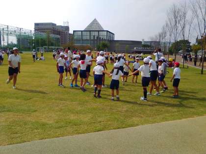 お弁当のあとは、班のみんなで遊んでいます。1〜6年生みんなが楽しめる遊びを考えて遊んでいます。普段はなかなか遊ぶことのできない芝生に子どもたちも大はしゃぎです!