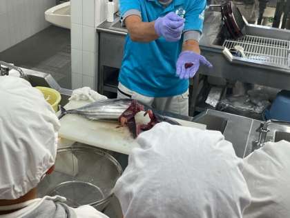 はじめにカツオの解体ショーを見せてもらい、いよいよ手こね寿司づくりのスタートです。