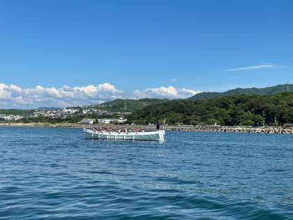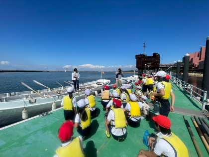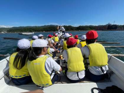 カッター体験をしました。みんなで「そーれ!1!2!」のかけ声に合わせて、力いっぱい櫂を漕いでいました。