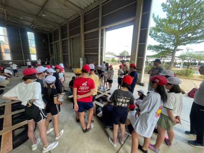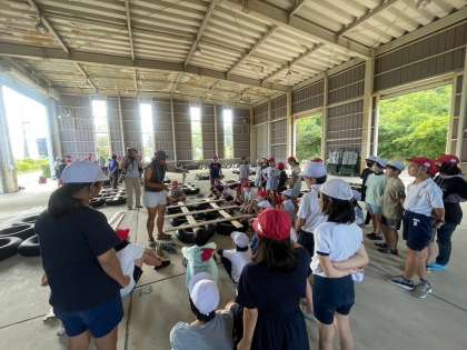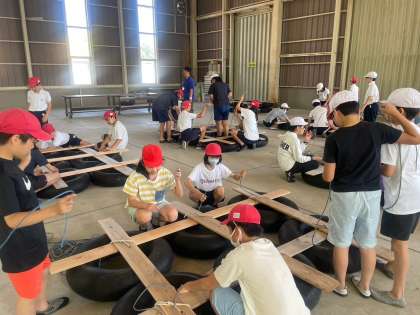 タイヤと木板とロープを使っていかだを一から組み立てました。一生懸命ロープを結び、協力して作っていました。