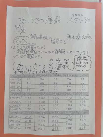 17日からあいさつ運動が始まっています。あべっこ班ごとに担当の日を決めて、それぞれの階段の下であいさつをしています。