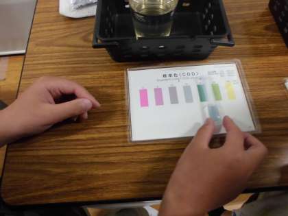 大阪府下水道教室の方やクリアウォーターOSAKAの方、大阪府下水道ボランティアの方をお迎えし、下水道について教えて頂きました。「下水道ばなし」では、下水道の役割を通じ水環境について考えました。また、水質実験ではCODパックテストを行い、身近な水(コーヒー・みそ汁・しょうゆ・お茶・学校の池の水)について調べました。きれいな水を大切にしなくてはならないと実感しました。