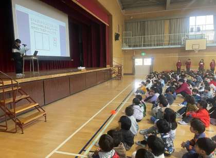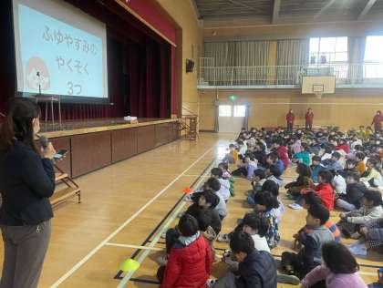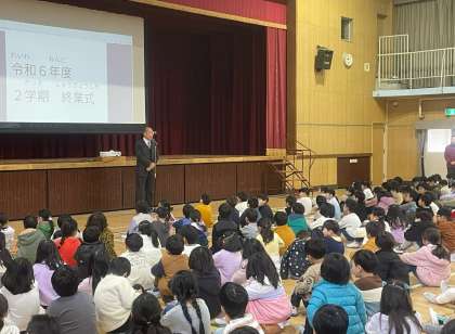 校長先生からは、「冬休みにはおうちでお手伝いをしよう」という話がありました。また、代表の児童が2学期をふり返って書いた作文を発表しました。社会見学や修学旅行の思い出、がんばったなわとびについて、みんなの前で堂々と発表していました。