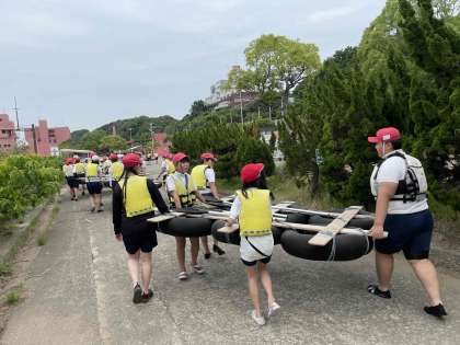 「あっち!あっち!」と声をかけているのに自分たちの思いとは違う方向へ進んでしまう班や、同じ場所でくるくる回る班、中にはいかだから転覆してしまう子もいましたが、全チーム無事に戻ってくることができました。