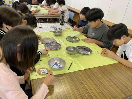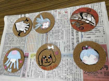 2日目はじめの活動は、コースターアートです。好きなものの絵を描いたり、自然体験学習の思い出を描いたりと、コルクのコースターに思い思いの絵を描きました。