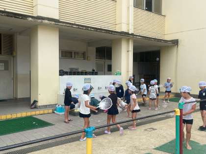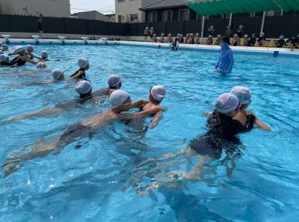 7月9日に1年生のプール納めがありました。今年も暑い日が多く、気持ちよくプールに入ることができました。1年生では、顔に水をつけることと、体の力を抜いて浮くことを目指して活動に取り組んできました。はじめは怖がっていた児童も見られましたが、だんだんと慣れてきて、最後まで楽しく学習に取り組むことができました。