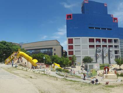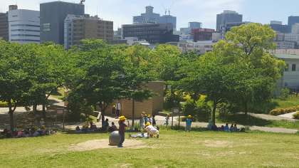 お弁当のあとは、みんなで遊んでいます。晴天の扇町公園には、他の小学校や幼稚園の子どもたちがたくさん。みんなゆずりあって楽しそうに遊んでいます。