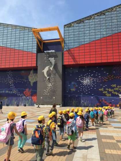 でっかい海遊館に「おー。」と、歓声。 さあ、グループ活動が始まります。