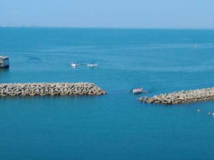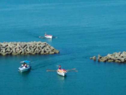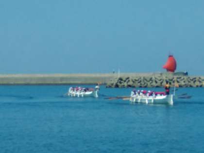 みんなで協力してオールを漕いでいます。かなり遠くまで進みました。