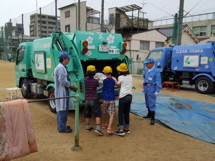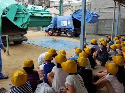 普段、自分たちの家から出るごみを回収しているパッカー車(ゴミ収集車)の見学をしました。環境事業局の方々にゲストティーチャーとして来ていただき、パッカー車について詳しく教えていただきました。また、ごみの投入や簡単な操作についても体験させていただきました。