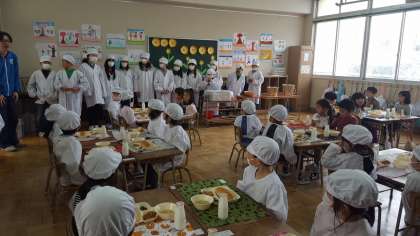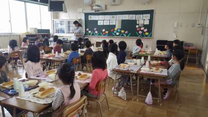 今日から給食がスタートしました。もちろん1年生は小学校生活最初の給食です。最初の2週間は、6年生のお兄さんお姉さんたちが準備を手伝ってくれます。