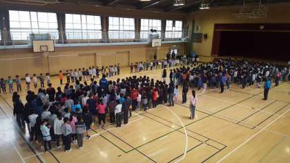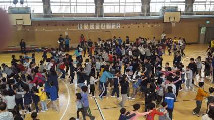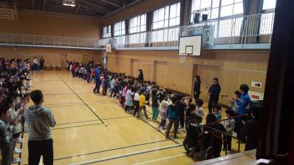 今日は1年生を迎える会。6年生に手をつないでもらい、1年生が講堂にやって来ました。今年度はじめて全学年集合しました。2年生からはお迎えのプレゼントとして、花の種をもらいました。さいごは、みんなで「じゃんけん列車」をして楽しく遊びました。