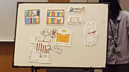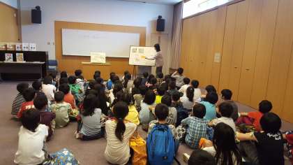 阿倍野図書館に見学に来ました。本の借り方など、図書館の使い方をパネルシアターで説明してもらいました。