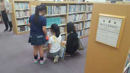館内を見学しました。図書検索用パソコン「オムリス」を使って、実際に本を探してみました。